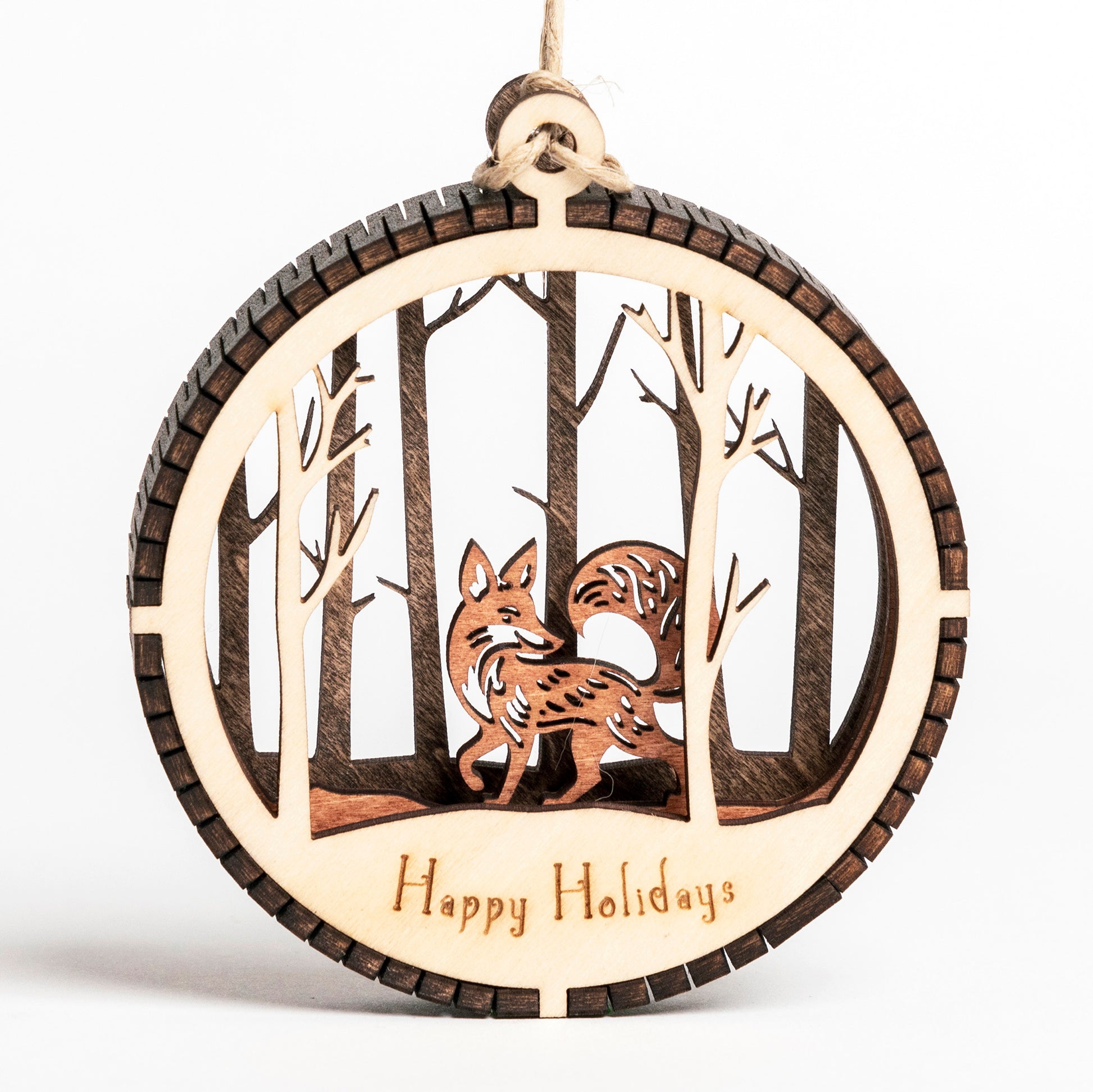 Bring the magic of the forest to your home with this charming fox ornament. Handcrafted from three layers of intricately laser-cut wood, it features an adorable fox gracefully weaving its way through the trees. The fox, a symbol beloved by many on Prince Edward Island, embodies the Island's culture, history, and natural beauty.