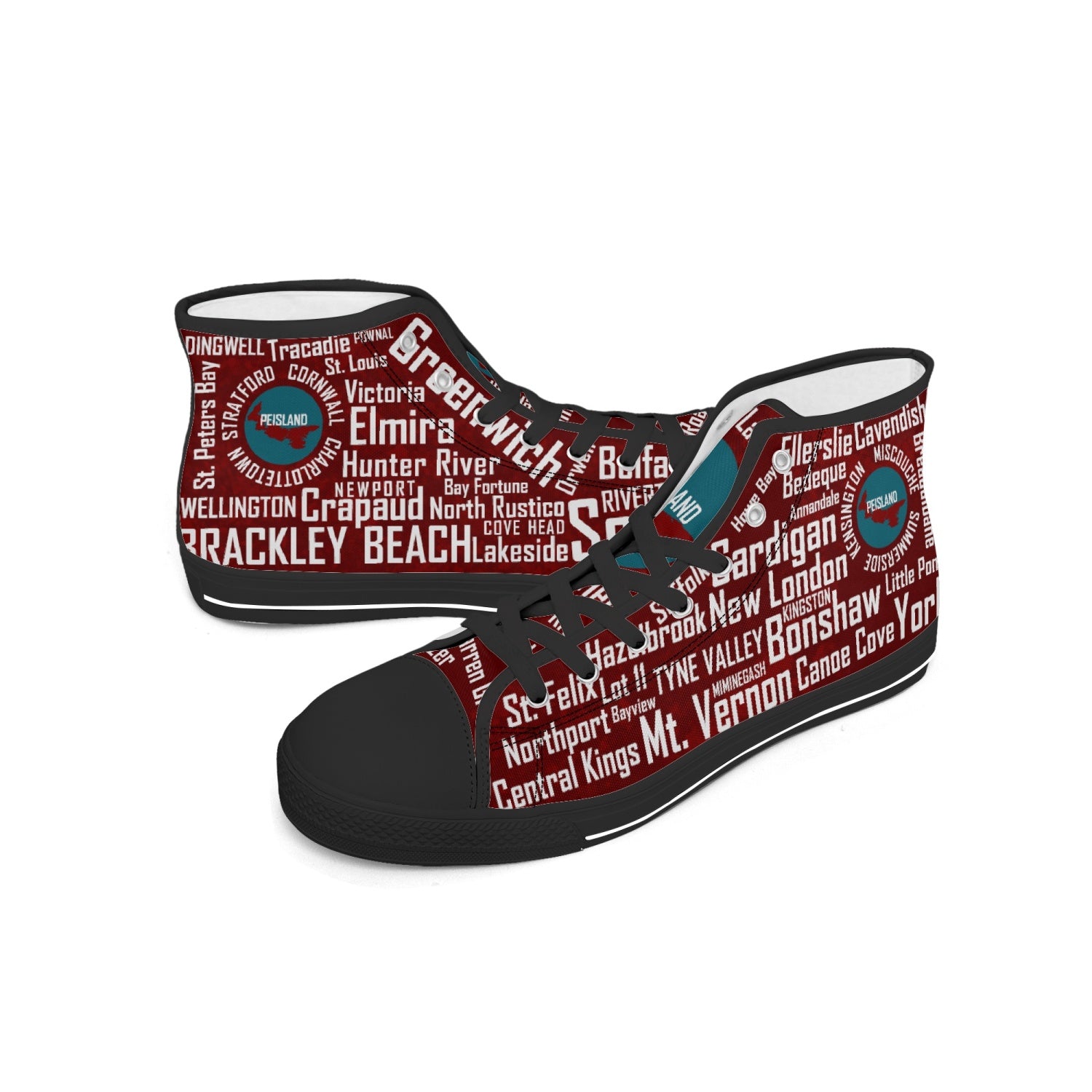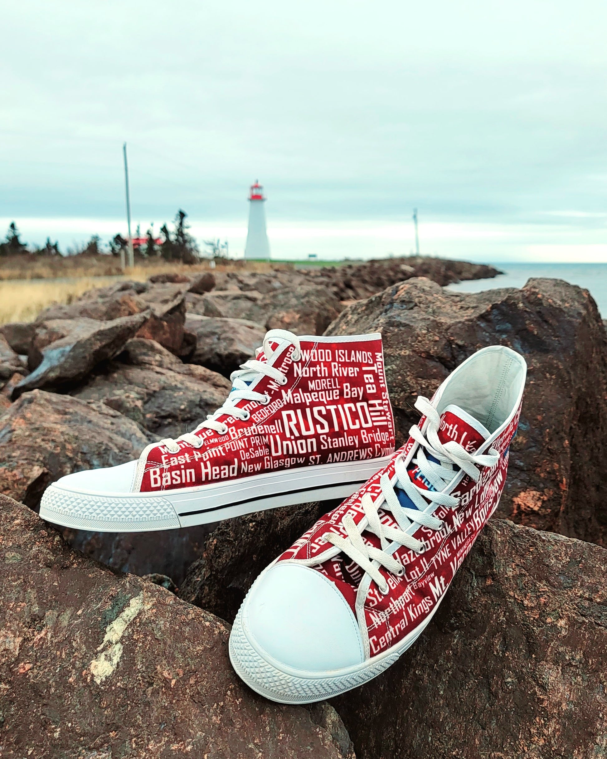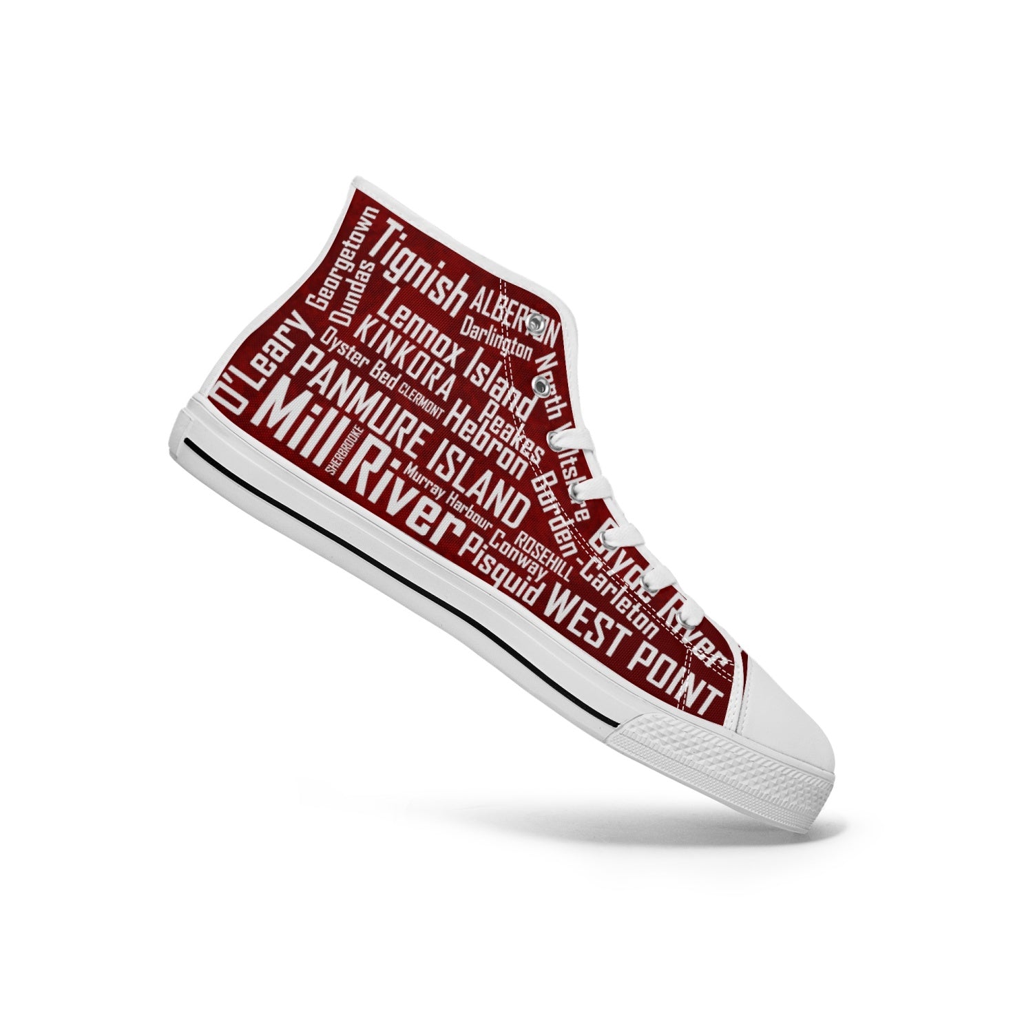 Introducing PEIsland Places, a stylish and unique high-top canvas shoe. These shoes are the perfect way to show off your love for Prince Edward Island. The burgundy canvas upper is adorned with the names of most of the communities on Prince Edward Island, making these shoes a true representation of the island and its people. The high-top design offers a comfortable and secure fit, while the durable canvas construction ensures that these shoes will last you for many adventures to come. Whether you're a native of Prince Edward Island or just a fan of the island, PEIsland Places are a must-have addition to your shoe collection.