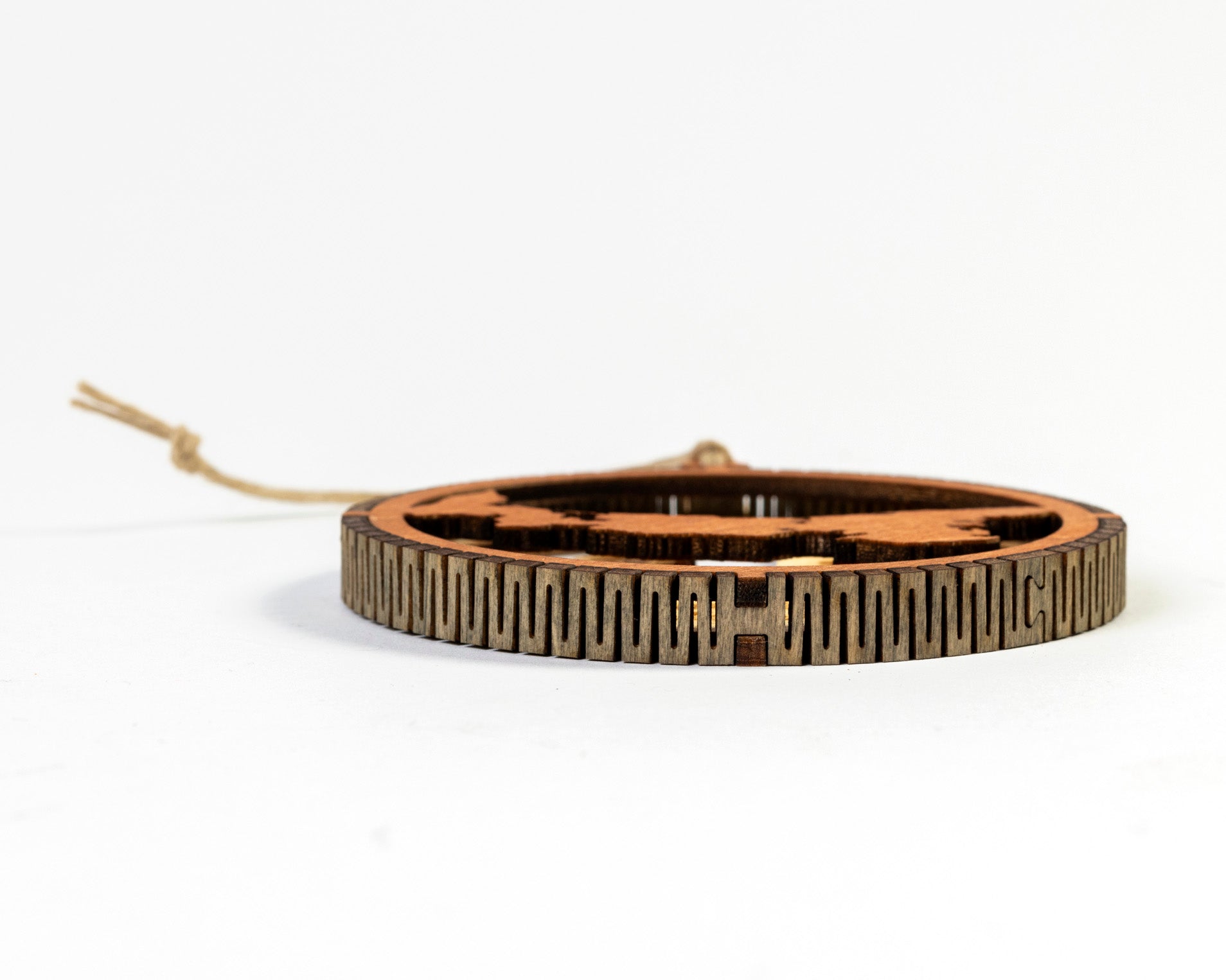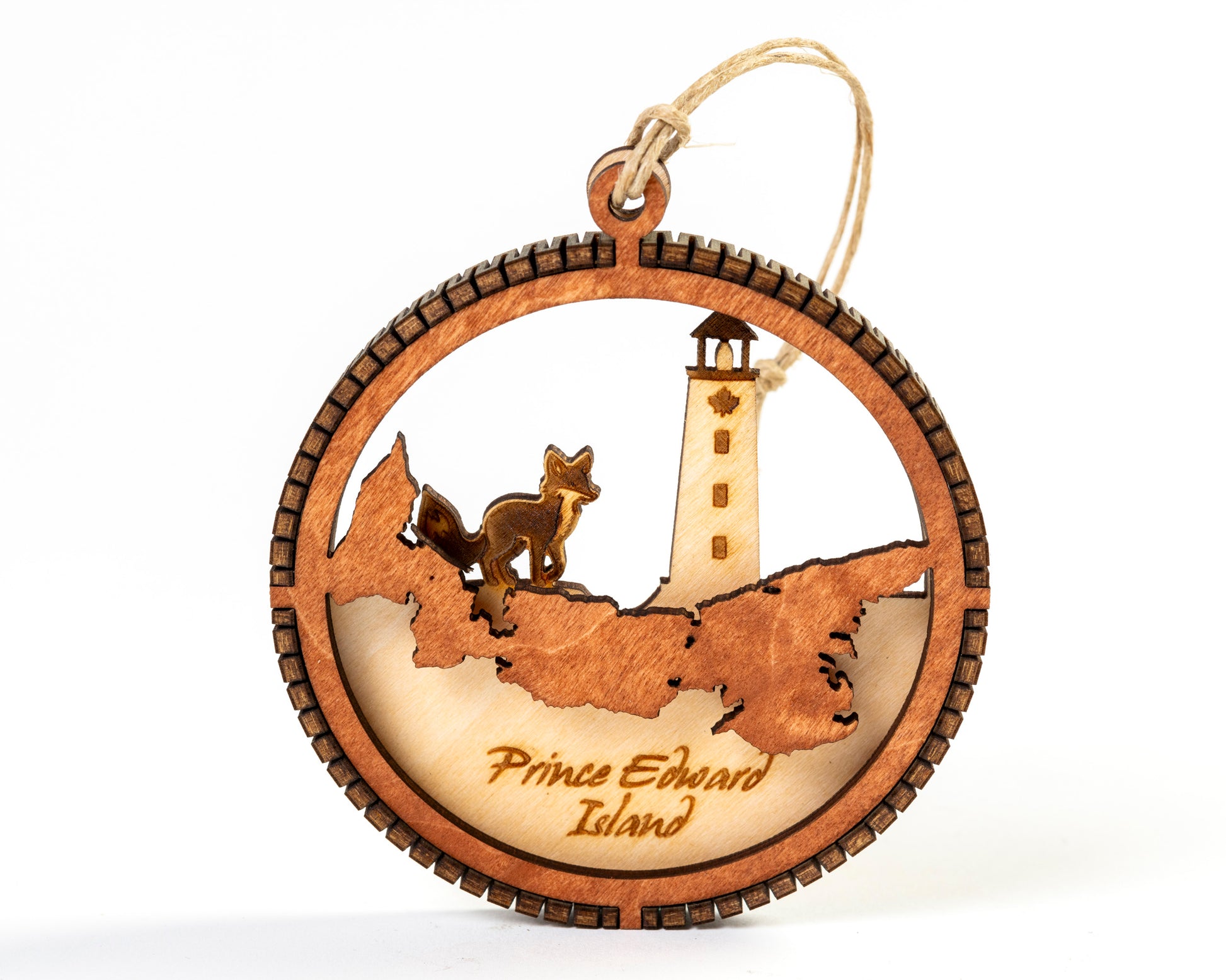 Featuring a charming map of Prince Edward Island on top, and a lighthouse and fox on the bottom layer, this laser-cut 3D ornament is held together with a living-hinge wooden band. Perfect for holiday decorating or sprucing up your space anytime, these 4-inch diameter, 3/8-inch thick beauties also bear the words "Prince Edward Island" engraved on the bottom layer, peeking out from behind the map cutout.