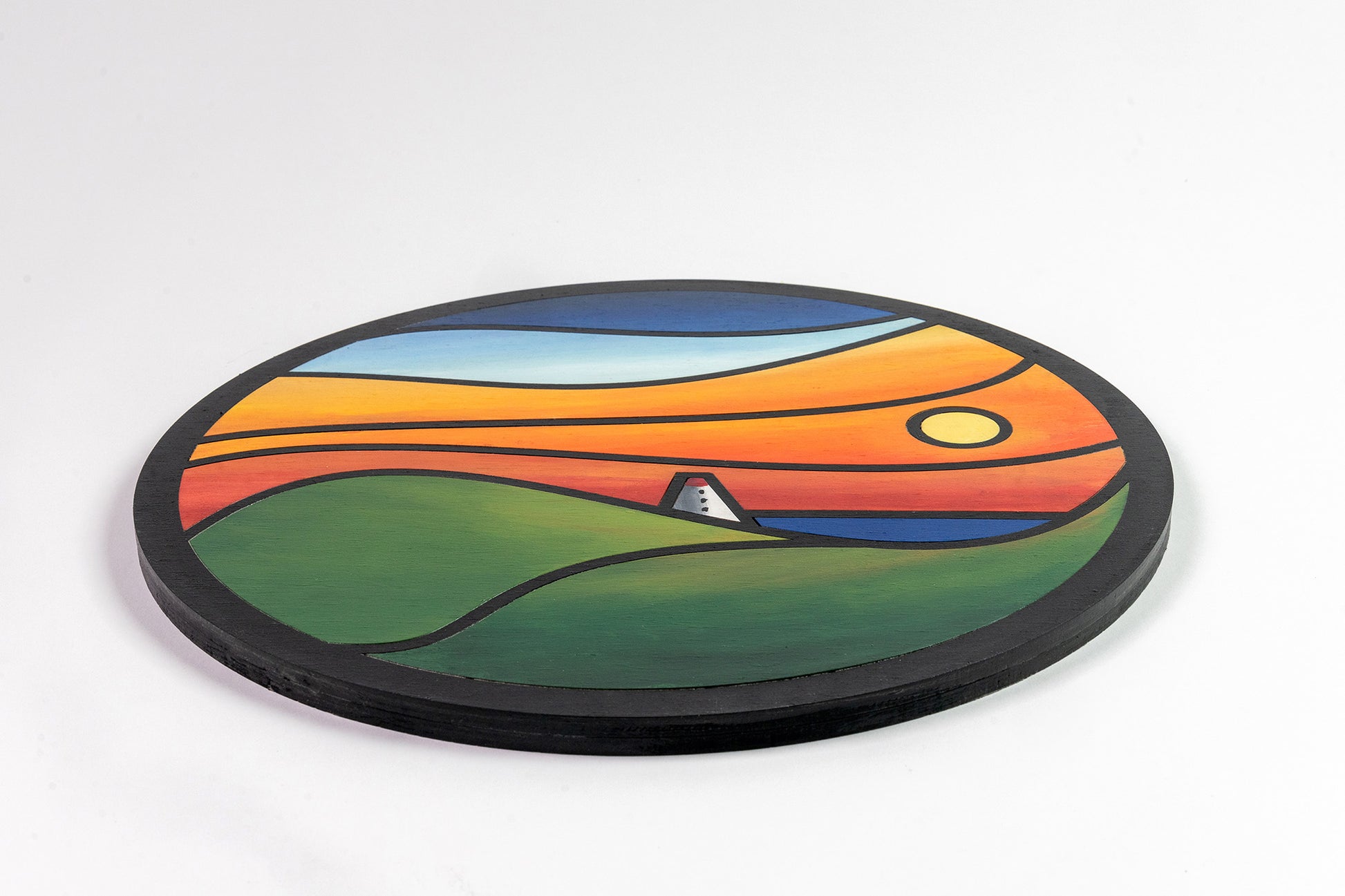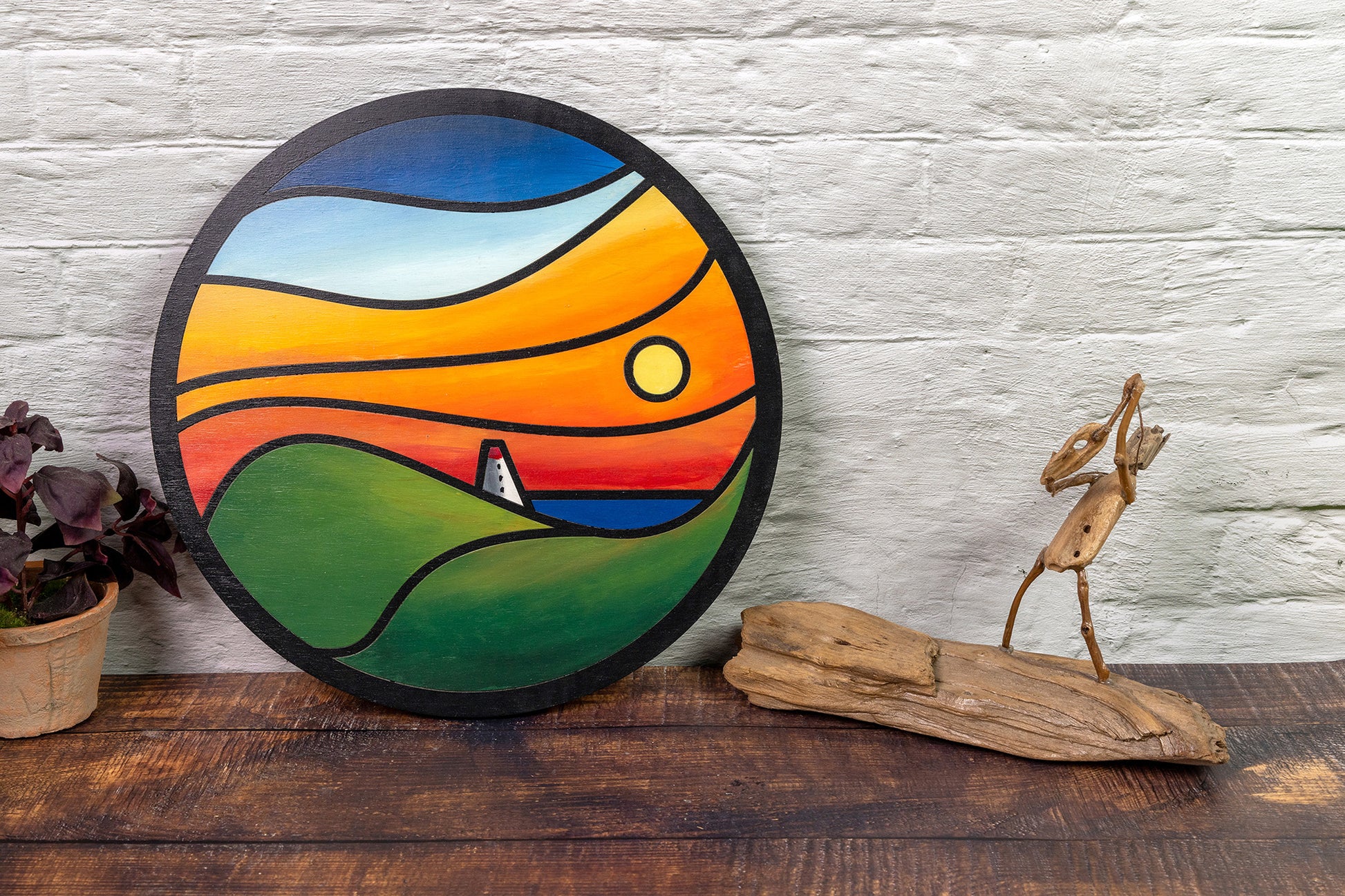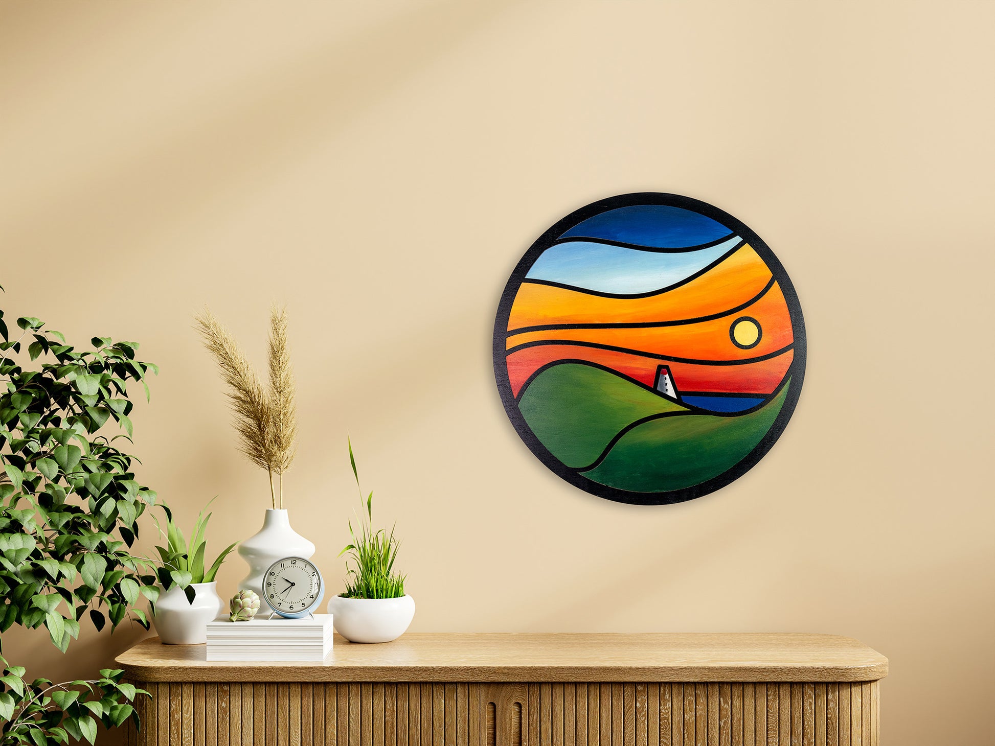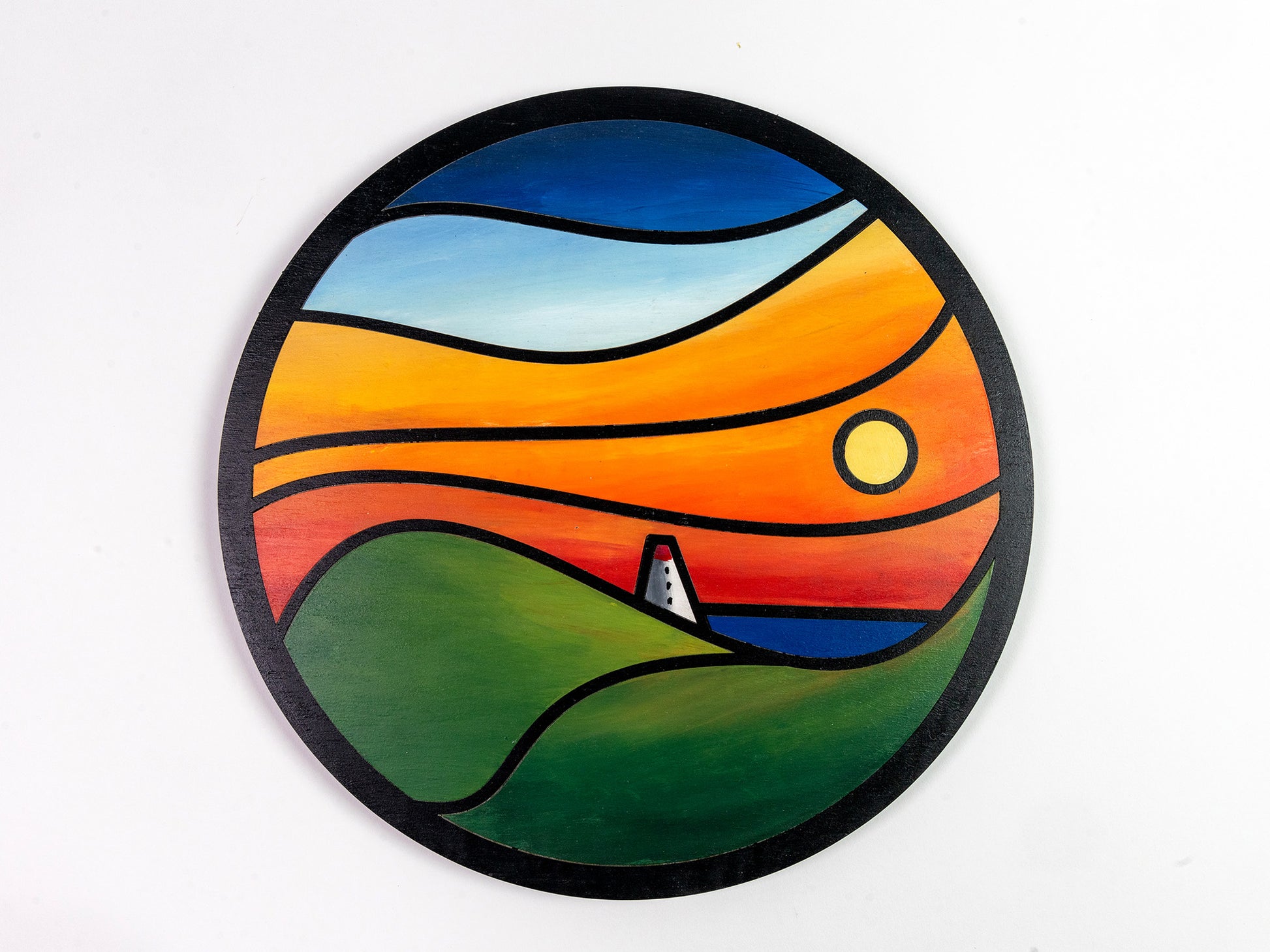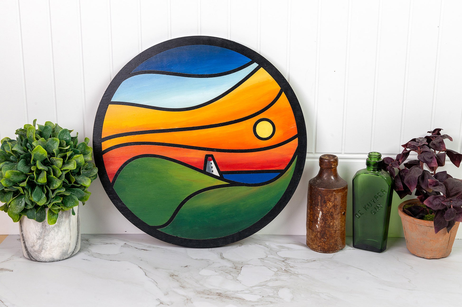 "Sunlit Lighthouse Serenity" - an extraordinary piece that captures the tranquil allure of coastal landscapes and the craftsmanship of hand-painted artistry. This acrylic painting on laser-cut aspen plywood brings a touch of natural beauty to your space, evoking the serene ambiance of a lighthouse set amidst rolling green hills, bathed in the warm hues of a setting or rising sun.